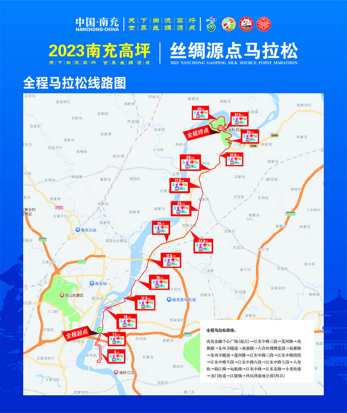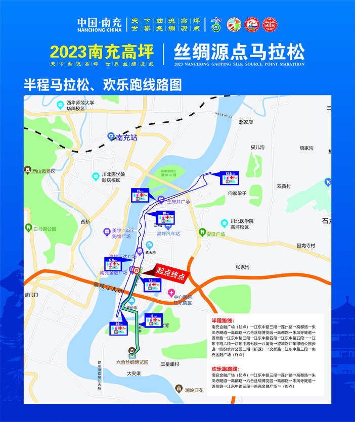 南充金融中心广场(起点)→江东中路三段→莲州路→高都路→朱凤寺隧道→高都路→六合丝绸博览园→高都路→朱凤寺隧道→莲州路→江东中路三段→南充金融中心广场一(终点)
